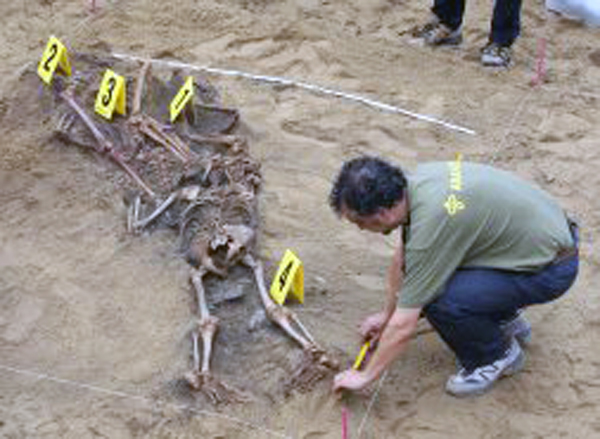 Miembros del Instituto de Medicina Legal, junto con Paco Etxeberria, presidente de la Sociedad de Ciencias Aranzadi y experto antropólogo, examinaron los restos humanos encontrados -uno boca arriba y tres boca abajo- y hallaron, además, un proyectil de arma de fuego. En la fosa localizada el lunes aparecieron dos.