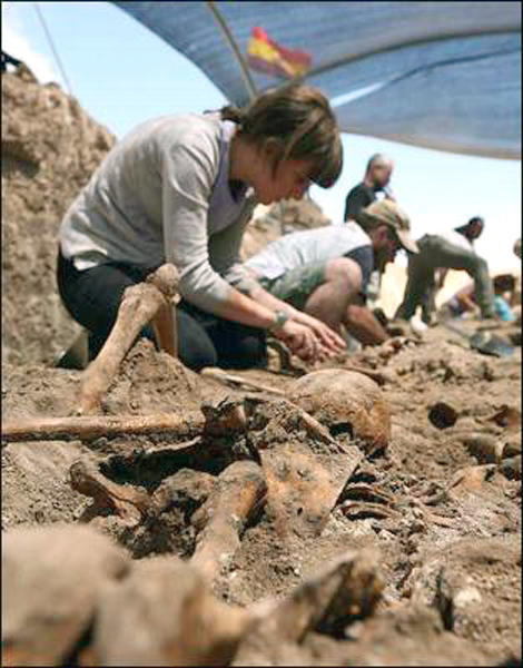 La visión extranjera también ayuda. Toda la excavación es filmada y registrada por periodistas de medios extranjeros. «Es increíble que esta imagen se vea en un país europeo en pleno siglo XXI.Es propio de Guatemala o de Kosovo», reflexiona la periodista de la televisión pública británica BBC Sue Lloyd-Roberts. Durante un mes prepara un reportaje sobre las dos caras que para los británicos tiene la España de 2009. La visita a Milagros estuvo precedida de otra a los San Fermines. «Hemos estado en Torremolinos, donde van un montón de británicos en busca de fiesta, sol y mar, y al día siguiente hemos filmado la exhumación de San Rafael. Queremos mostrarles la parte de atrás de la fiesta», explica la periodista.
