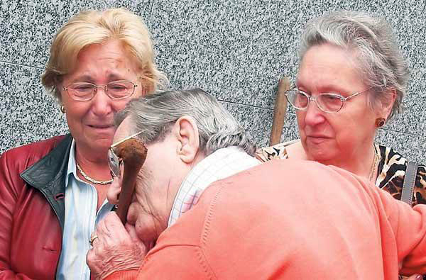 La menor de los hermanos, Carmen se inclinó sobre la sepultura, pidió uno de los huesos y lo besó. El gesto fue imitado de inmediato por sus dos hermanos, incapaces de contener las lágrimas por el reencuentro después de 71 años de incertidumbre, ya que sólo sabían el lugar aproximado en el que reposaba. El silencio, en este momento, era literalmente sepulcral. Nadie allí presente fue capaz de romper la íntima escena.
