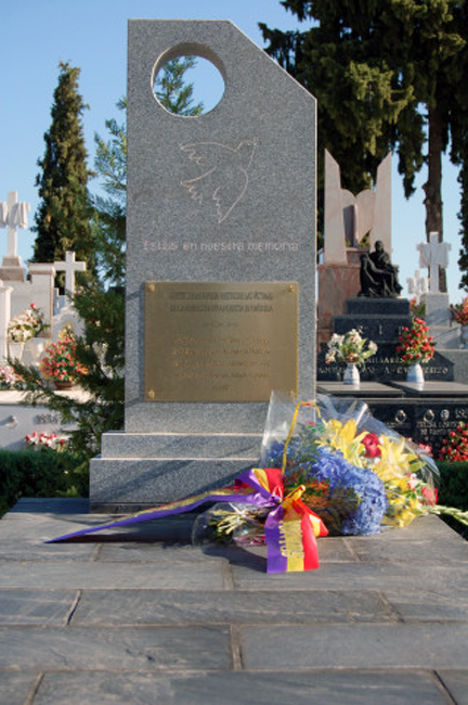 El eje central del camposanto se culmina en su parte más alta con un mausoleo erigido en recuerdo de los miles de asesinados por la barbarie franquista; una placa de mármol con el símbolo de la paz, en medio de un hermoso parterre sembrado de flores y cientos de nombres inscritos en papel cebolla, casi ingrávidos, un olivo y una encina símbolos extremeños esperan en una macetita ser plantados, cuatro columnas romanas lo delimitan, y el nicho donde fueron enterrados, ayer 20 de septiembre 2009, los restos óseos exhumados el año pasado de las funestes fosas de las tapias del cementerio por jóvenes voluntarios. Grabado en el mármol: Estáis en nuestra memoria y la paloma de la Paz sobrevuela estas palabras.