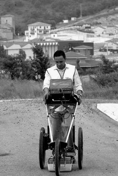 El técnico Israel Mendoza, con el geo-radar en junio en Oteiza. E.BUXENS
