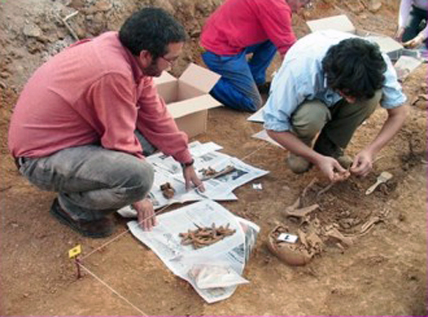 En la fotografía el Profesor Luis Ríos (Antropólogo Físico Universidad Autónoma de Madrid)»recoge» los restos de uno de los inhumados ayudado por el Profesor Julián López (Antropólogo Social).