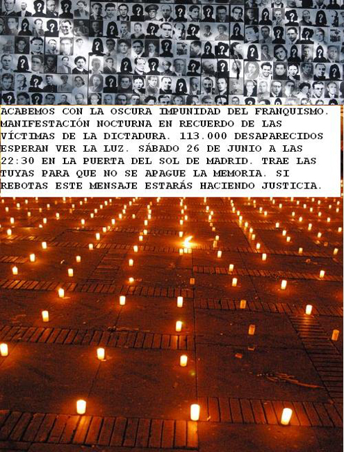 La Plataforma Contra la Impunidad del Franquismo convoca el próximo sábado en la Puerta del Sol de Madrid una concentración nocturna (a las 22:30 horas) para llenar esa plaza de velas en recuerdo de los 113.000 desaparecidos y desaparecidas de la dictadura y para que sus familias ejerzan su derecho a la verdad, a la justicia y a la reparación.