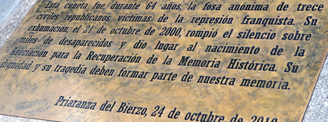 El 24 de octubre de 2000 aparecían los restos de Emilio Silva Faba al borde de una cuneta en la nacional 536 a la entrada de Priaranza del Bierzo (León). Con él, se rescataron los cuerpos de otras 12 víctimas de la represión franquista en unos trabajos de exhumación que habían empezado tres días antes. Ayer, en ese mismo punto del camino donde se recuperaron los cuerpos de los trece de Priaranza, la Asociación para la Recuperación de la Memoria Histórica (ARMH) inauguró una placa para testimoniar «que aquí nació el silencio y aquí se murió el silencio«, en palabras del presidente de la asociación, Emilio Silva Barrera, nieto de uno de los asesinados.