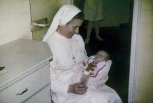 Una monja con la hija de Dolores Chumillas en 1978 en la clínica San Francisco Javier de Bilbao.-
