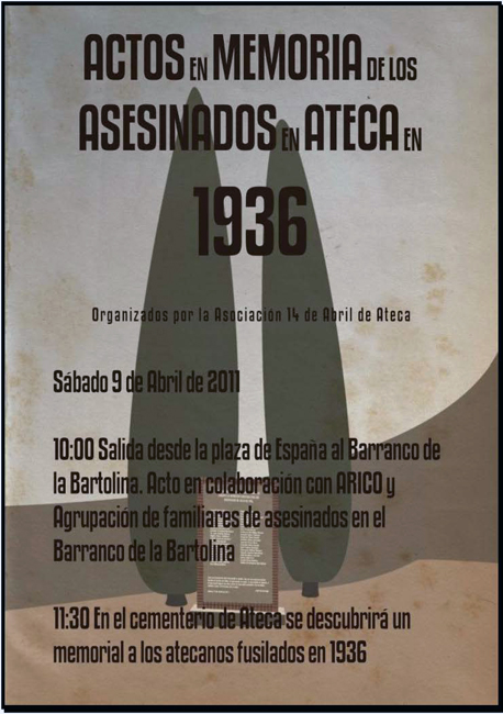 11,30 de la mañana: En el cementerio de Ateca se descubrirá un monumento-memorial con los nombres de todos los atecanos asesinados en 1936, realizado por suscripción popular y con la colaboración del Ayuntamiento de Ateca.