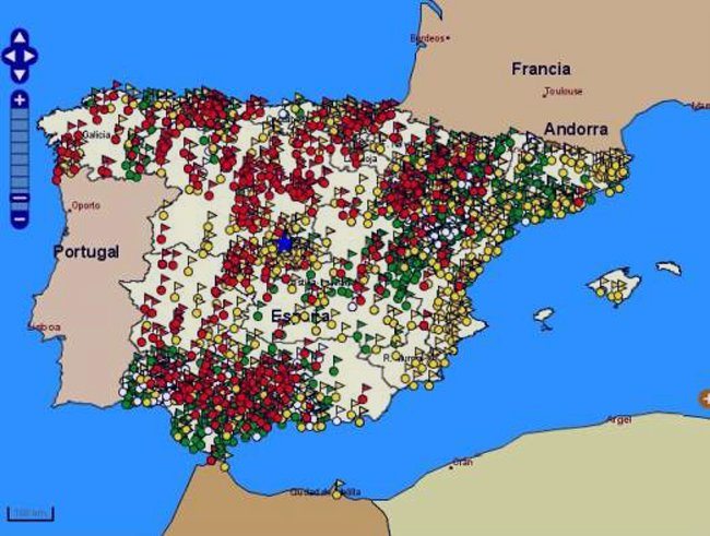 En ella se muestran todas las fosas de las que tiene constanciala oficina de víctimas: las exhumadas, las que sólo lo han sido parcialmente, las que contenían cuerpos que fueron trasladados en su día al Valle de los Caídos, las que han desaparecido porque sobre ellas se ha construido algún tipo de infraestructura y las que todavía no han sido tocadas.