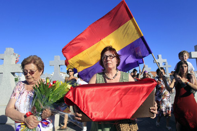 Las 16 familias recorrieron el pueblo portando los pequeños féretros en los que los miembros del Foro por la Memoria que exhumaron esta fosa en julio del año pasado habían colocado los restos. A las puertas del cementerio atravesaron un pasillo de aplausos y banderas republicanas. Las 16 cajas quedaron enterradas bajo una enorme lápida, ahora sí, con sus nombres y apellidos. Muy cerca de allí, en la tapia donde habían sido asesinados, aún podían verse las pintadas que gente del pueblo realizó mientras se llevaba a cabo la exhumación el año pasado y en las que se podía leer: “No acabarán con nosotros. Viva Franco, siempre en nuestros corazones”, junto al símbolo de Falange.