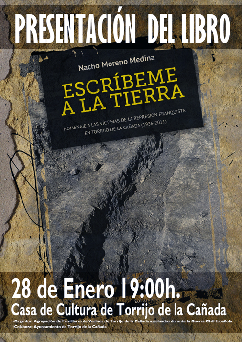 OS INVITO A LA PRESENTACIÓN DE MI NUEVO LIBRO «ESCRÍBEME A LA TIERRA: HOMENAJE A LAS VÍCTIMAS DE LA REPRESIÓN FRANQUISTA EN TORRIJO DE LA CAÑADA (1936-2011)», que ha sido editado por la editorial Aqua y financiado por la Agrupación de Familiares de Vecinos de Torrijo de la Cañada asesinados durante la guerra civil.