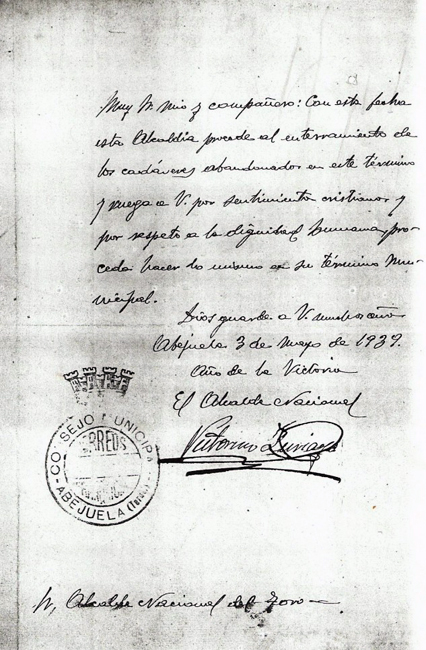 José Orduña relató a ELPLURAL.COM que el 3 de mayo de 1939, el acalde de Abejuela escribió a su colega, el alcalde de El Toro, en estos términos “Muy señor mío y compañero: Con esta fecha esta Alcaldía procede al enterramiento de los cadáveres abandonados en este término municipal y ruega a V. por sentimiento cristiano y por respeto a la dignidad humana, proceda hacer lo mismo en su término municipal. Dios guarde a V. muchos años. Abejuela 3 de mayo de 1939, año de la Victoria”. Firma el escrito “el alcalde nacional”, uno documento al que ha tenido acceso ELPLURAL.COM.