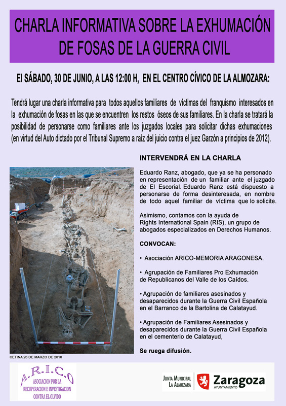 El sábado 30 de junio a las 12,00 horas en el centro cívico de La Almozara (Avenida Puerta Sancho Nº30 de Zaragoza), el abogado Eduardo Ranz explicara a todos aquellos familiares que estén interesados en denunciar ante el juzgado la desaparición de alguno de sus familiares los tramites a seguir.