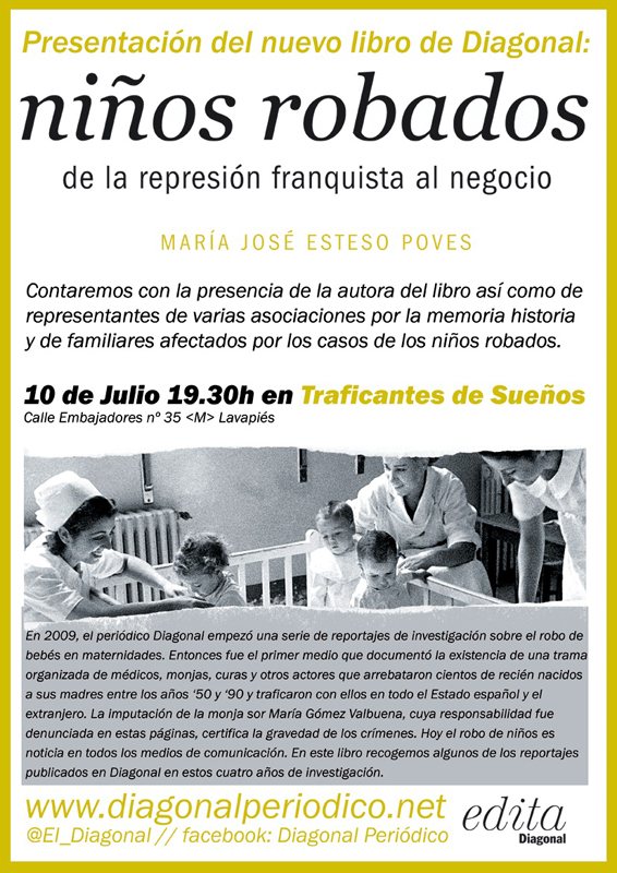 El martes 10 de julio, presentamos el libro: Niños robados, de la represión franquista al negocio, editado por el periódico Diagonal con una recopilación de mis textos de investigación sobre los niños robados.