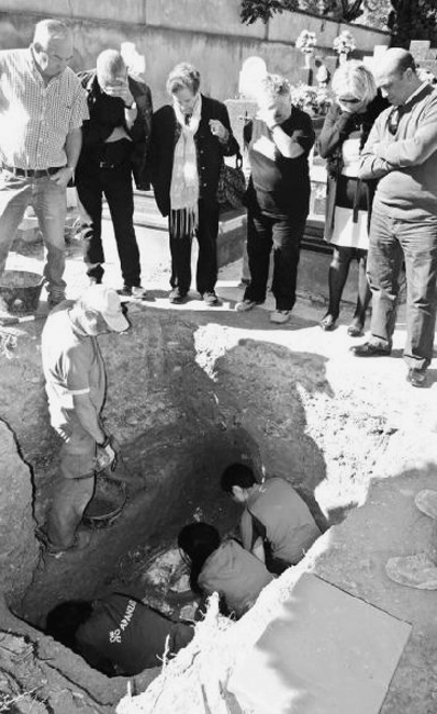 VARIOS DISPAROS La exhumación se desarrolló durante toda la mañana y en ella estuvieron presentes la hija de Carmelo Jiménez, Carmen, y dos de sus nietos. La primera cumplió seis meses el día que fusilaron a su padre, un electricista vecino de Cascante, de 42 años, afiliado a UGT, y padre de 9 hijos. «En mi casa se ha hablado muy poco de esto, pero de mis padres siempre he oído que mi abuelo estaba enterrado en el cementerio de Tudela; no sabía si dentro o fuera, pero sí al lado del muro», recordó Carmelo Jiménez, nieto del asesinado.