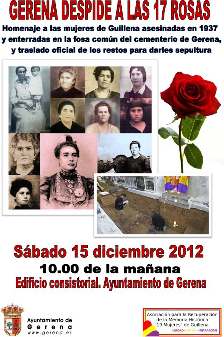Los restos de las mujeres de Guillena asesinadas durante la Guerra Civil y enterradas en una fosa común del cementerio de Gerena, serán trasladados a su localidad natal el próximo sábado 15 de diciembre para darles sepultura. Previamente se realizará un breve y sencillo acto de homenaje a las víctimas, conocidas como las “17 Rosas”. En este tributo participarán la alcaldesa de Gerena, Margarita Gutiérrez, y representantes de la Asociación para la Recuperación de la Memoria Histórica de Guillena, que agrupa a los familiares de las mujeres asesinadas en 1937.El Ayuntamiento de Gerena custodia los restos desde que fueron exhumados, tras las excavaciones realizadas en el cementerio y finalizadas el pasado febrero. Durante estos meses se han realizado las pruebas científicas para identificar los huesos y cotejarlos con el ADN de sus descendientes.