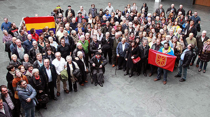Personas relacionadas con víctimas de la represión franquista posan en el atrio del Parlamento tras aprobarse la ley. (Bergasa)