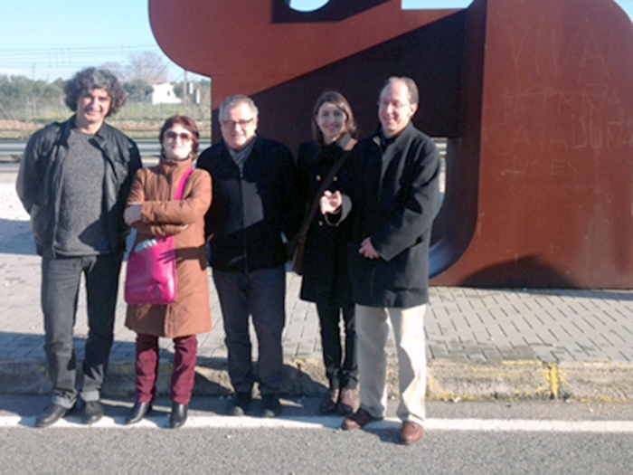 Pablo de Grieff, a la derecha, junto a dirigentes andaluces del movimiento memorialista ante el monumento que recuerda el viejo campo de concentración de Los Merinales, a las afueras de Sevilla.RAFAEL GUERRERO
