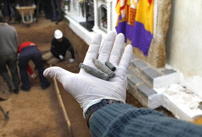 Casquillos de bala localizados por los arqueólogos en una fosa común del cementerio de San José en Gerena (Sevilla). / JUAN FERRERAS (EFE)