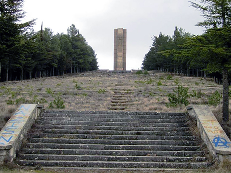 Allí, en mitad de un monte tupido de pino, encinas y quejigos, una gran escalinata asciende a un cerro en el que se levanta una torre de hormigón de 22 metros de altura; un gran columna rematada por el escudo de la España franquista. Un monumento que se erigió entre abril y junio de 1939 y en el que trabajaron centenares de presos republicanos y vecinos de los pueblos aledaños. Y con piedra y áridos de la cantera cercana de Villalómez.