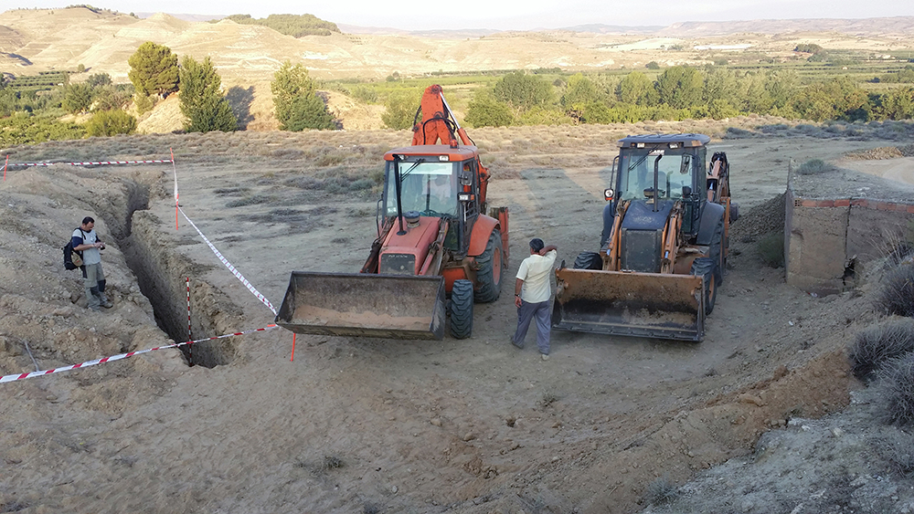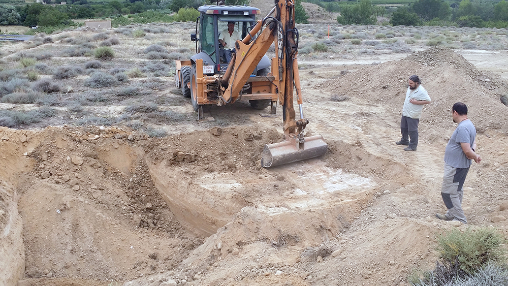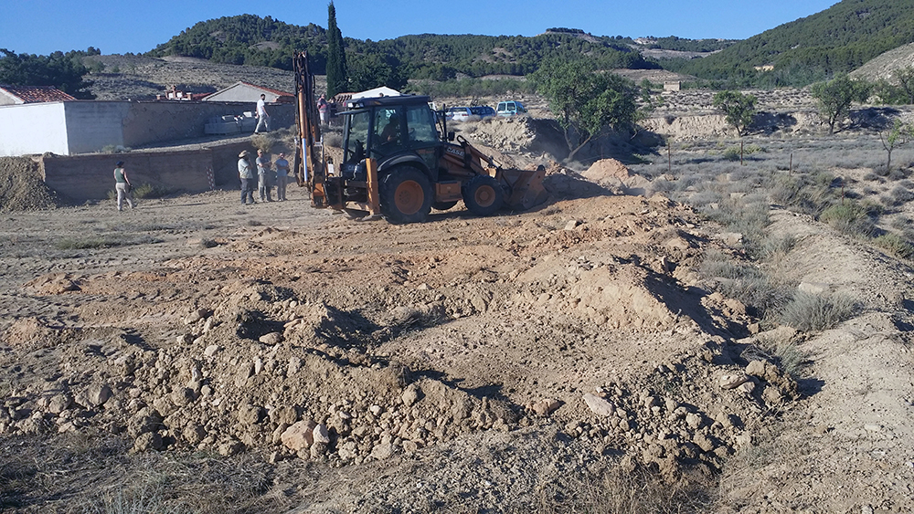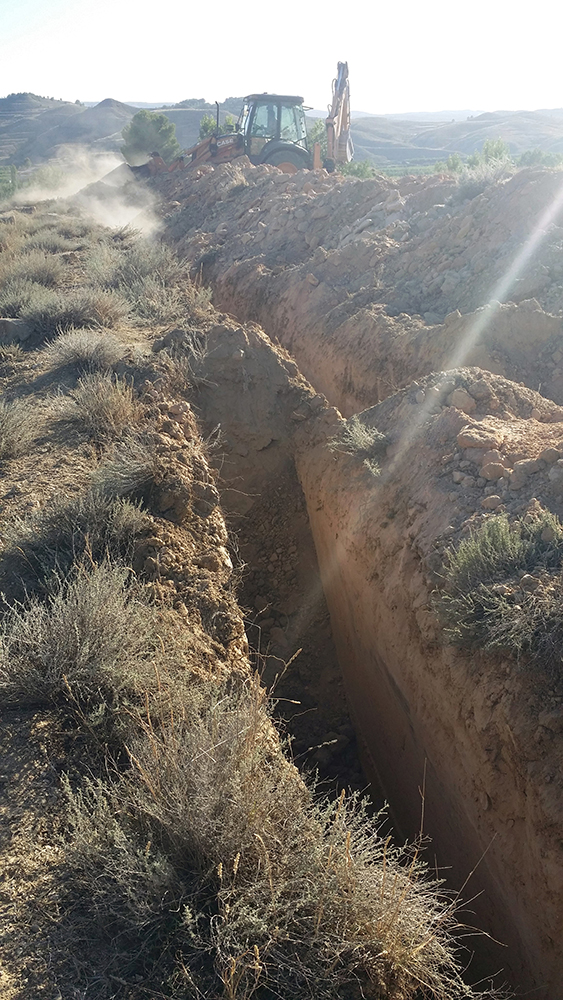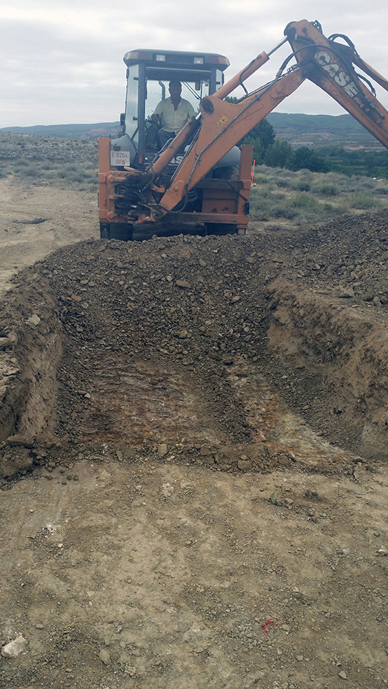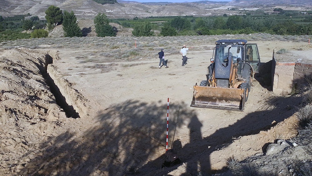 Como último recurso se planteó por parte del equipo arqueológico la realización de zanjas paralelas y distantes 1 metro entre sí, excavadas con ayuda de medios mecánicos y bajo supervisión arqueológica. Cuando ya había sondeado de esta manera aproximadamente la mitad del campo, con una superficie total de 1800 m2, y comenzaba a cundir el desánimo, se localizó la fosa a poco más de medio metro de profundidad. La causa hay que buscarla en el aterrazamiento del terreno hace unos 40 años con la finalidad de plantar frutales y establecer unas acequias para el riego, este hecho obligó a igualar el desnivel del terreno y eliminó aproximadamente un metro de altura de tierra en este punto.