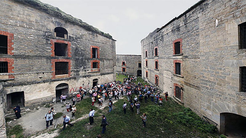 Imagen de los pabellones del fuerte de Ezcaba durante una concurrida visita a su interior. (PATXI CASCANTE)