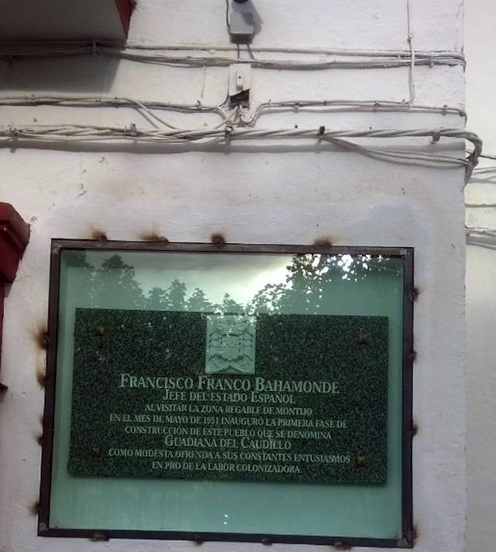 En el interior, el nombre de Francisco Franco y un recuerdo de su paso por la localidad en 1951 “como ofrendas a sus constantes entusiasmos en pro de la labor colonizadora” en este municipio que nació al calor del Plan Badajoz.