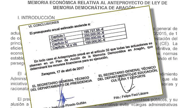 En torno a un millón de euros es lo que le costará a Aragón anualmente la puesta en marcha de su nueva Ley de la Memoria Democrática, impulsada por el Gobierno aragonés PSOE-Chunta y que a su vez se enmarca en los compromisos de investidura a los que el socialista Javier Lambán llegó en su día con Podemos e IU.