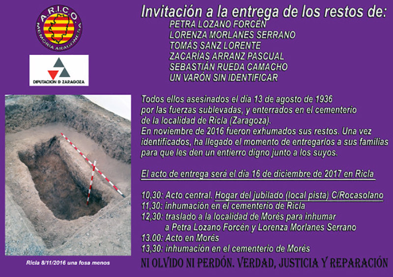 El sábado 16 de diciembre la Asociación por la Recuperación e Investigación Contra el Olvido (A.R.I.C.O) ha preparado un acto de entrega de seis de las 45 personas asesinadas en Ricla por el fascismo en la Guerra Civil.