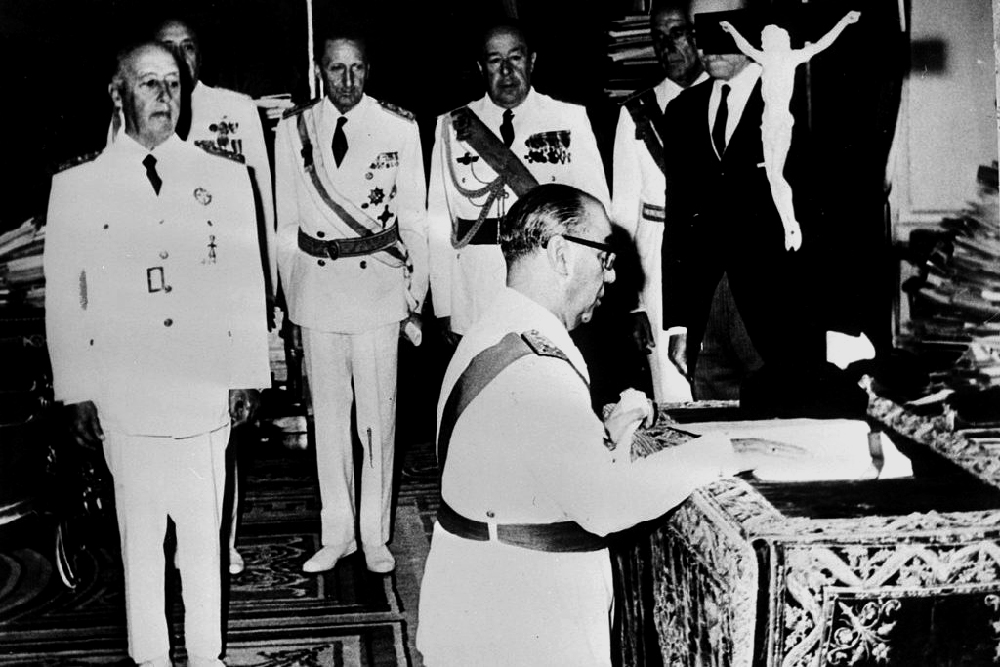 El almirante Luis Carrero Blanco jura uno de sus cargos en presencia de Franco. Foto: Wikimedia